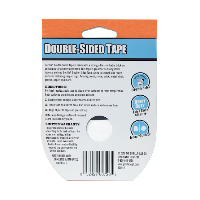 Gorilla double-sided tape is made with a strong adhesive that is thick on both sides for a heavy duty bond. This tape is great for securing items indoors and out. Gorilla® double-sided tape sticks to smooth and rough surfaces including carpet, rugs, flooring, wood, stone, brick, metal, vinyl, plastic, paper, and more.