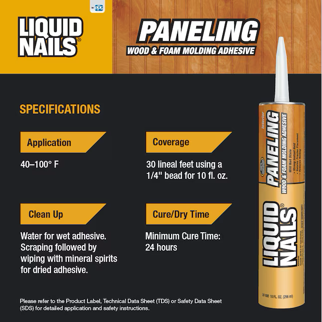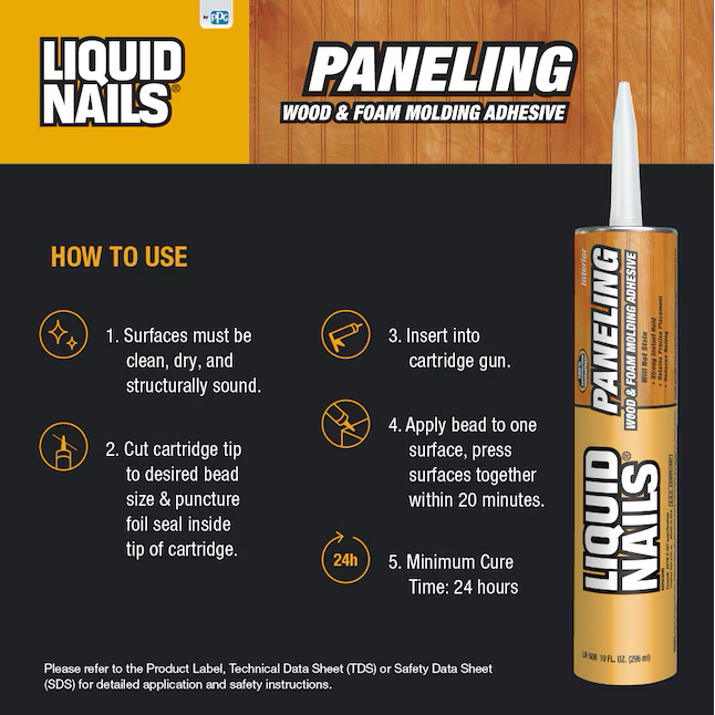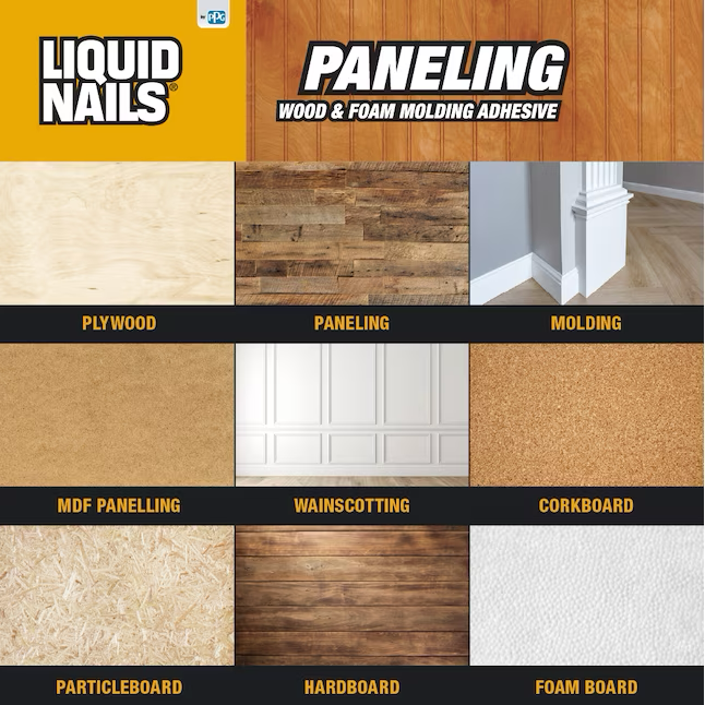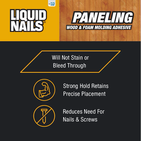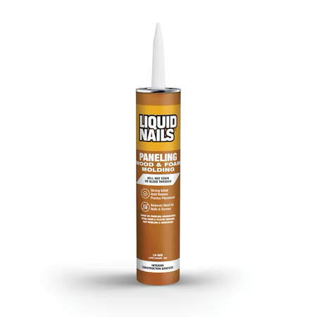 LIQUID NAILS® Paneling Wood and Foam Molding Adhesive (LN-606) is specially designed for interior projects like paneling and molding where the instant hold is needed. The fast, sure hold of this construction adhesive provides precision placement and minimizes nailing. Twenty-minute open time and an impact-resistant bond.