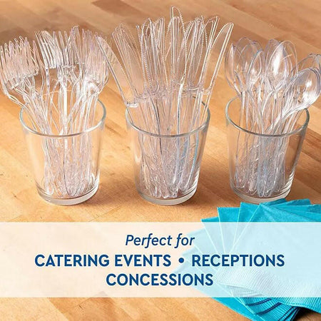 When you're feeding a crowd, use Member's Mark™ Clear Cutlery Combo Pack. This plastic cutlery set comes with 360 durable and heavyweight pieces for long-lasting use. There are 120 forks, 120 spoons and 120 knives in each package. These clear plastic utensils have a sleek and modern design that will complement any table setting. They're ideal for both casual and formal gatherings. Whether you're hosting a holiday dinner party or a summer cookout, keep these forks, knives and spoons on hand for easy access to disposable cutlery anytime you need it.