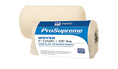 PPG Paints ProSupreme 4"x3/8" woven roller cover offers superior capacity, coverage, and finish quality for excellent performance. The shed-resistant, white woven fabric provides a virtually lint-free finish for faster, easier painting. Dense fibers reduce dripping, resulting in less clean up and neater results. The thick polypropylene core resists water, solvents, and cracks for long-lasting dependability. Multi-purpose cover is ideal with all paints, flat to gloss, and enamels.