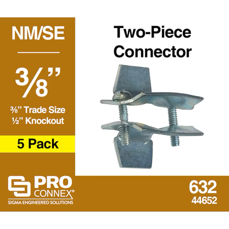 The Sigma ProConnex butterfly style, two-piece clamp connectors are used to terminate one or more NM or SE cables to a 1/2-in knockout in a dry location box or enclosure. These zinc-plated stamped steel connectors do not require a locknut.