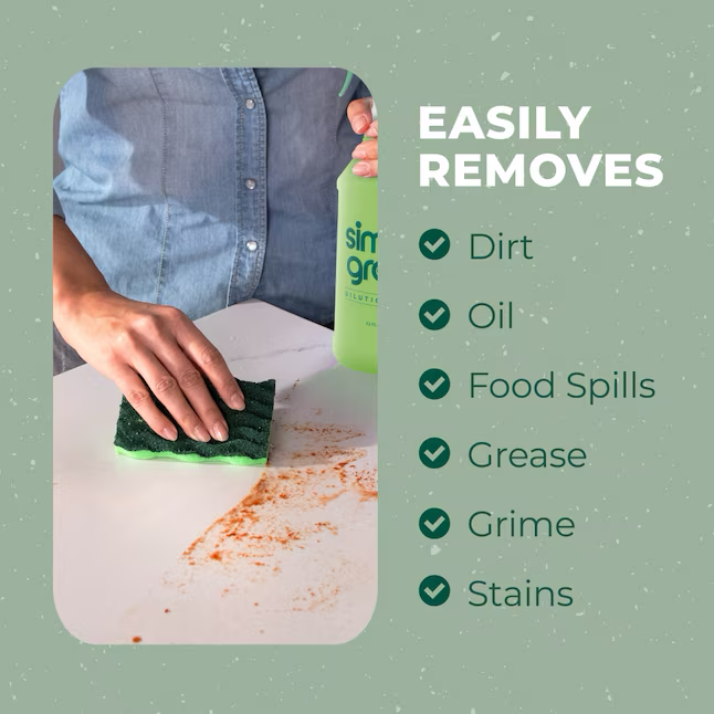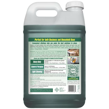 EPA Safer Choice Certified Simple Green All-Purpose Cleaner is a powerful cleaner and degreaser designed for effective and environmentally safer use on all washable surfaces. The formula easily removes tough dirt and grime without chemicals that can harm people and the environment. Concentrated formula provides up to 30x the cleaning value. Use it full-strength for heavy messes, or easily dilute with water for daily cleaning. Removes built-up dirt, grease, food spills, ink, pet stains and other tough grime indoors and out. For use on floors, carpets, walls, countertops, appliances, furniture, fabric, tools and more. This versatile cleaner can easily replace a cabinet full of harsh cleaners, detergents, degreasers and laundry pre-soaks, making clean-up simple and safer. Deodorizes with a fresh sassafras scent. This formula is readily biodegradable per OECD 301D.