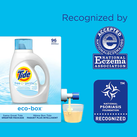 Have peace of mind with Tide Free and Gentle Liquid Laundry Detergent that will keep your clothes brilliantly clean and your family's skin safe. Tide Free and Gentle is a powerful hypoallergenic laundry detergent that is free of dyes and perfumes. It removes more residue from dirt, food and stains than the leading Free detergent.