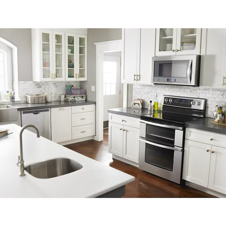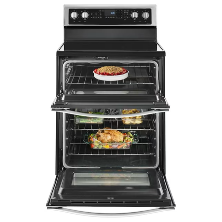 Get dinner on the table quickly with this electric double oven range. True convection cooking lets you cook food faster. Convection Conversion will do the math for you to adjust cooking times and temperatures. Skip preheating this kitchen range for frozen favorites like pizza, lasagna, chicken nuggets, fries or pies, thanks to Frozen Bake™ technology. The FlexHeat™ triple radiant element is like having three elements in one to fit small pots and pans and make room for larger cookware on the range stove. And if you make a mess, AquaLift® self-cleaning technology provides this kitchen range with odor-free cleaning without harsh chemicals in only 50 minutes.