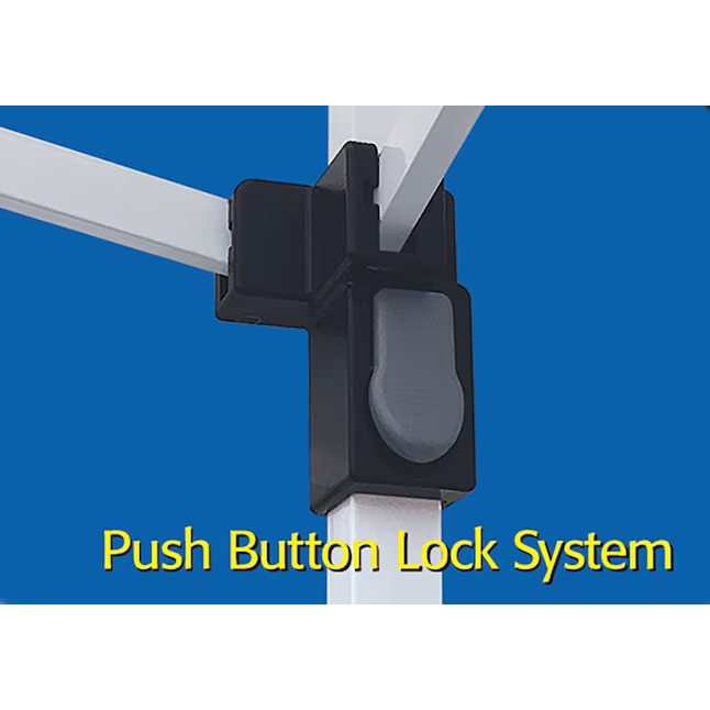 For setting up with partner, grasp outer leg to some distance, assemble canopy top, grasp truss on opposite sides, push hands together to open it, engage 6 push button sliders to lock the frame, press 6 push button locks to adjust legs to desired height
