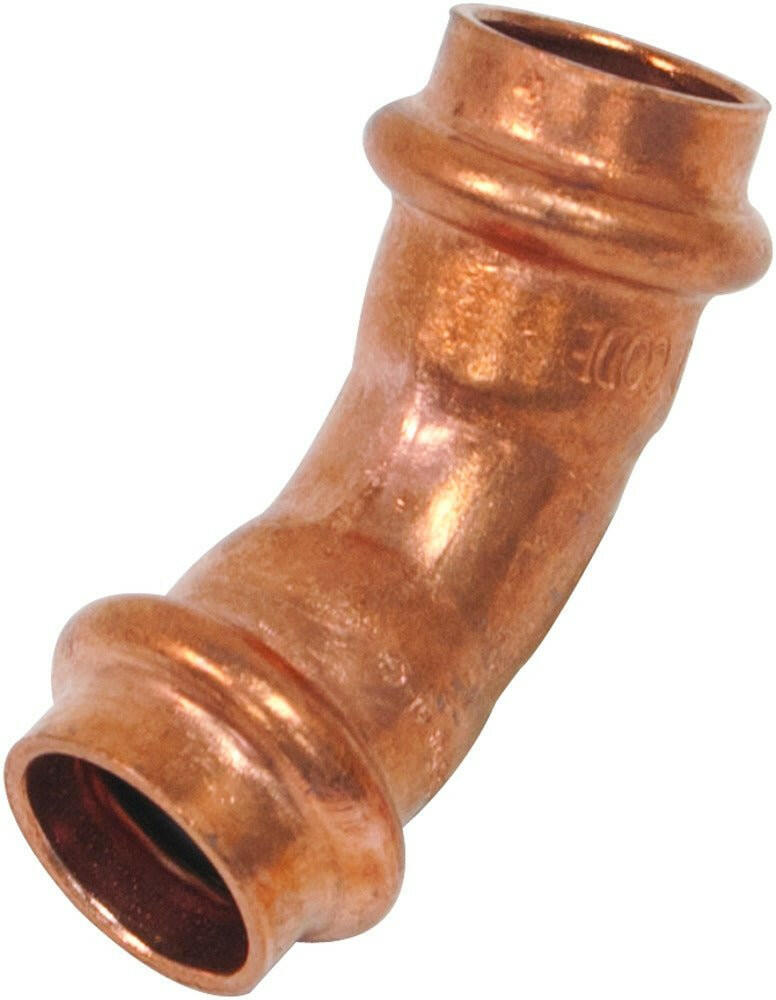 The 1/2 inch x 1/2 inch Copper Press x Press Pressure 45-Degree Elbow features an high-quality EPDM O-ring to create a tight, leak-free seal. Easy to use, simply apply pressure from a pressing tool to tighten the O-ring onto the tube, ensuring a clean, watertight seal in seconds with no flame, solder, or flux. Connections can be made in wet or dry conditions reducing project downtime. The coupling is compatible with all major hydraulic press tools and is NSF listed and lead-free.