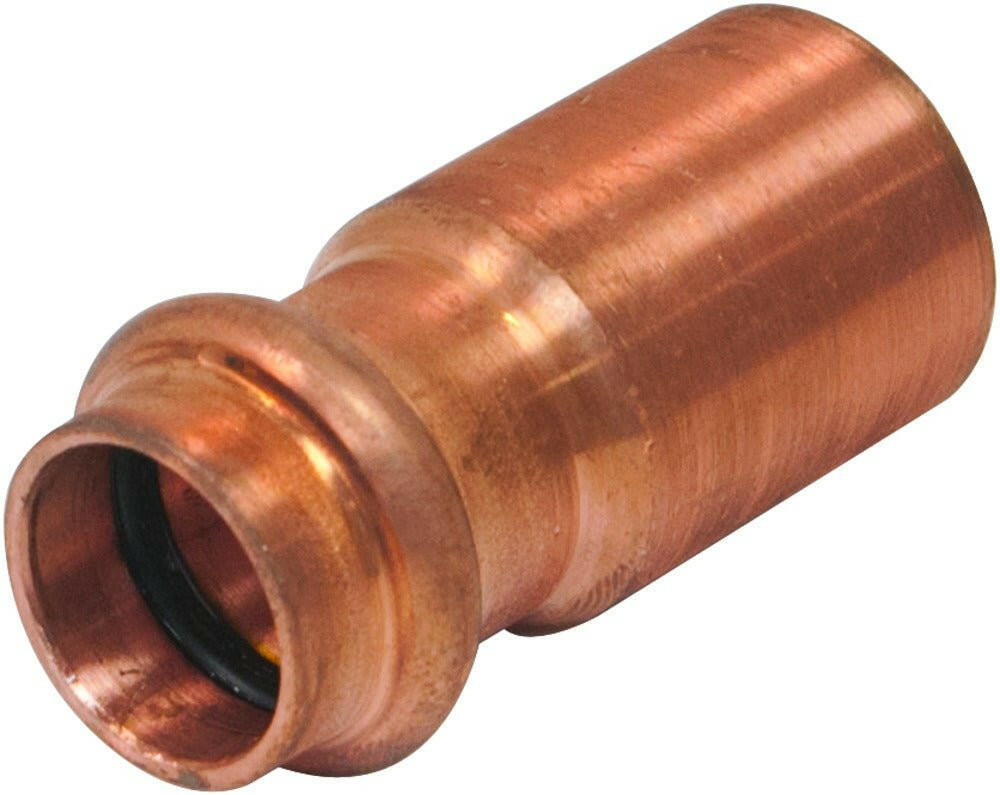 The 3/4 inch x 1/2 inch Copper FTG x Press Pressure Reducer Coupling features an high-quality EPDM O-ring to create a tight, leak-free seal. Easy to use, simply apply pressure from a pressing tool to tighten the O-ring onto the tube, ensuring a clean, watertight seal in seconds with no flame, solder, or flux. Connections can be made in wet or dry conditions reducing project downtime. The coupling is compatible with all major hydraulic press tools and is NSF listed and lead-free.