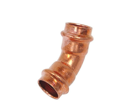 The 3/4 inch x 3/4 inch Copper Press x Press Pressure 45-Degree Elbow features an high-quality EPDM O-ring to create a tight, leak-free seal. Easy to use, simply apply pressure from a pressing tool to tighten the O-ring onto the tube, ensuring a clean, watertight seal in seconds with no flame, solder, or flux. Connections can be made in wet or dry conditions reducing project downtime. The coupling is compatible with all major hydraulic press tools and is NSF listed and lead-free.