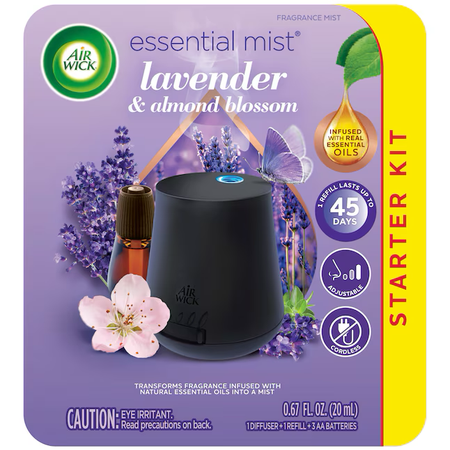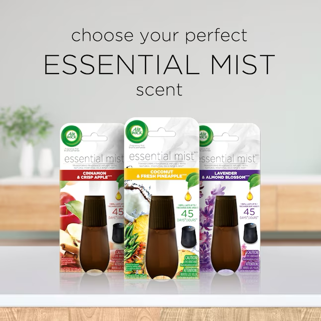 Discover the more natural and premium fragrance experience of essential oils diffused by mist with new Air Wick essential mist diffuser. It transforms natural essential oils into a gentle, fragrant mist that surrounds your home with the fragrances you love. 5 premium fragrance available in refills: lavender and almond blossom, fresh water breeze, mandarin and sweet orange, peony and jasmine, cinnamon and apple crisp.