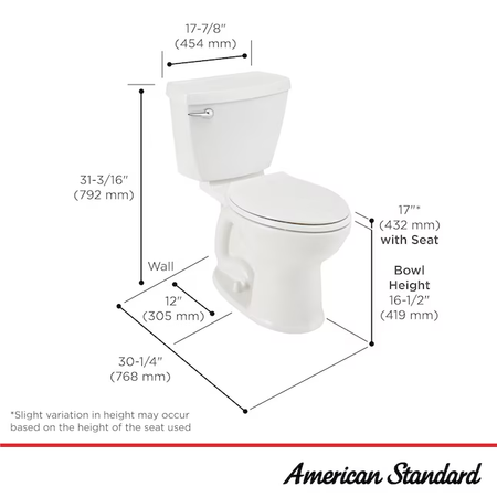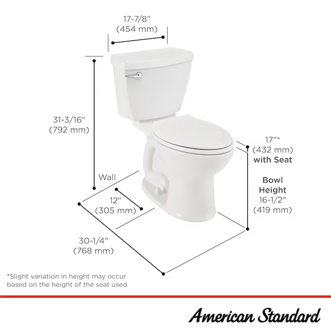 - Dimensions Assembled Depth (Inches) 30.25 Bowl Height with Seat 17-in Assembled Height (Inches) 31.1875 Bowl Height without Seat 16-1/2-in Rough-In Size 12-in Assembled Width (Inches) 17.875 Trapway Size 2-3/8-in Bowl Height Chair height