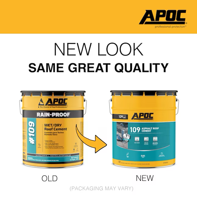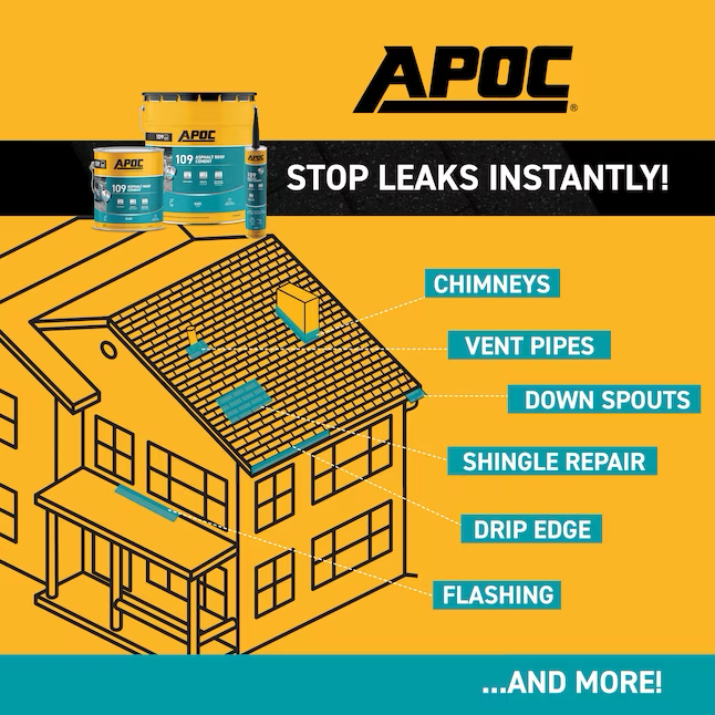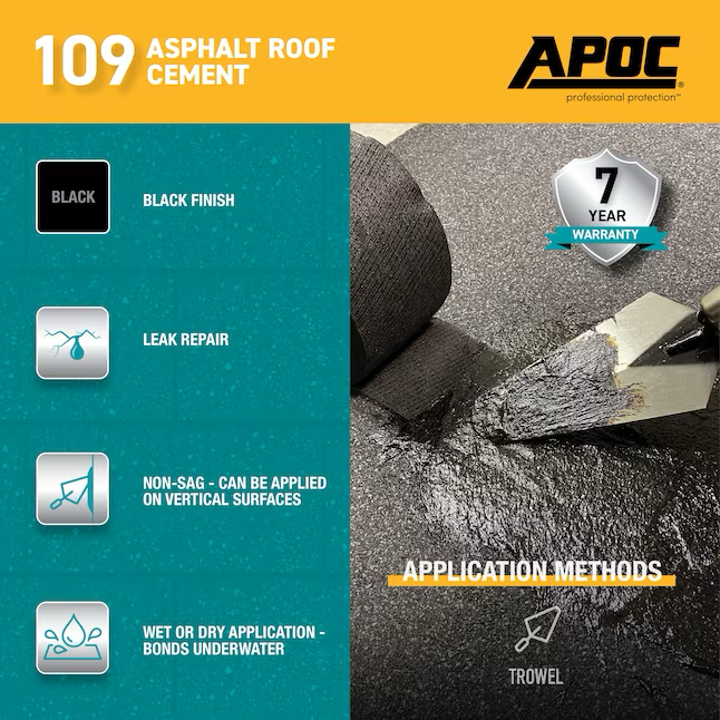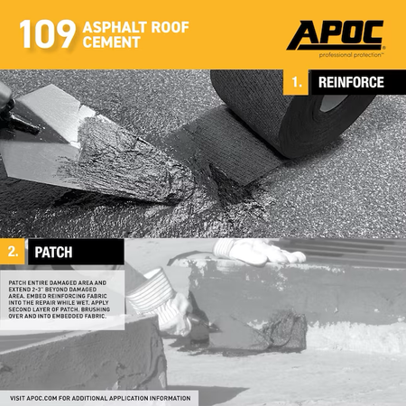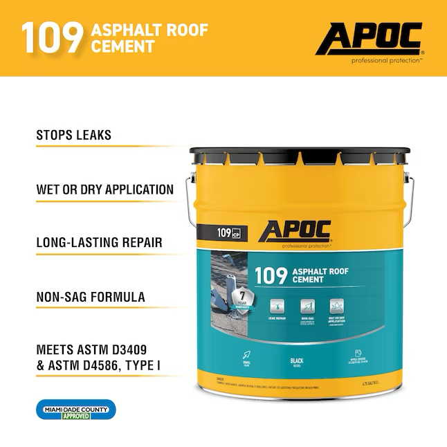 APOC 109 Asphalt Roof Cement is a durable, all-weather, long-lasting leak-repair designed to be applied in wet or dry applications such as: patching splits, cracks and seams in spudded gravel, mineral surfaced cap sheet and smooth surface asphalt roofs, as well as composition shingle roofs. APOC 109 can also be used in vertical applications and will not sag. It can be used for sealing around chimneys, vent pipes, gravel guards, down spouts, cracks in concrete and more. APOC 109 is also an excellent utility mastic for use below grade in heavy duty foundation waterproofing and dampproofing systems. APOC 109 exceeds performance requirements of ASTM D3409 and ASTM D4586, TYPE I and is Miami-Dade County Product Control Approved.