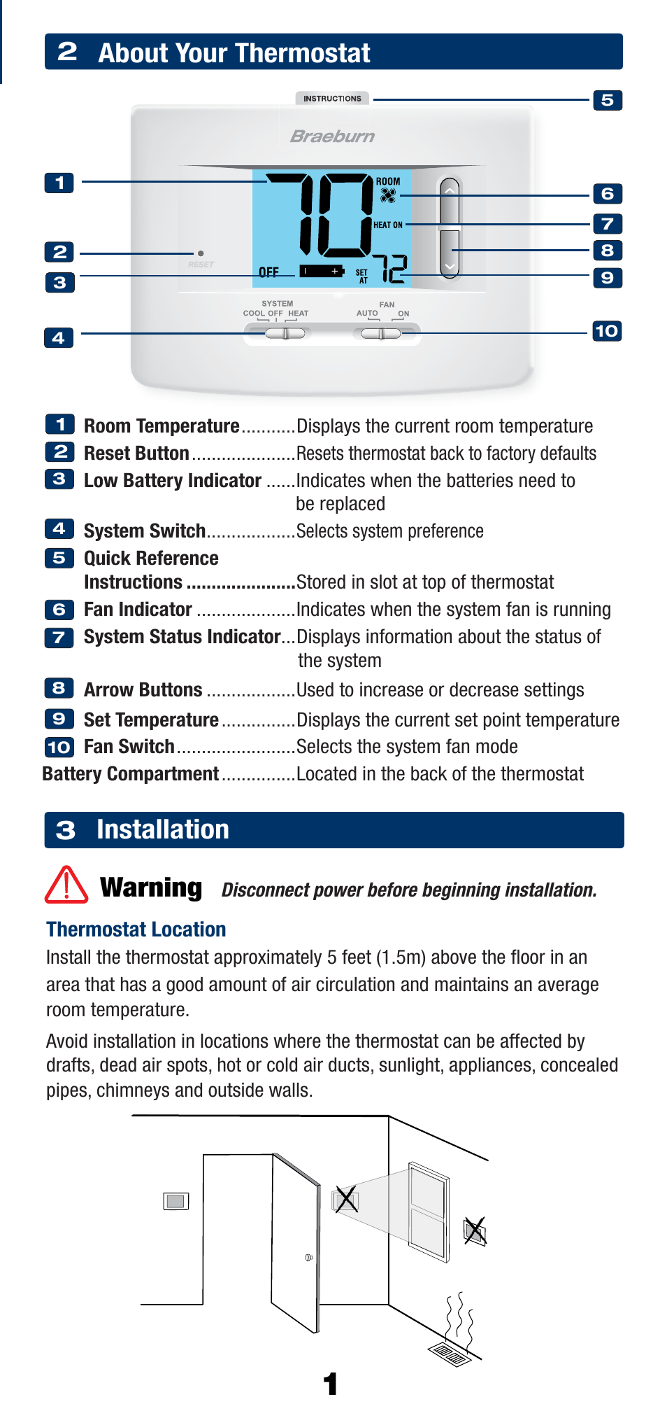 The digital non-programmable thermostat shall be a Braeburn1220NC number 1220NC, 3.62” high x 4.72” wide x 1.38” deep, powered independently with either 24 vac or two “aa” alkaline batteries (3.0 volt dc). the thermostat shall be compatible with multi-stage conventional or heat pump systems with up to two stages of heating and one stage of cooling and heat pump systems with one compressor and up to one auxiliary stage. The thermostat shall have a bright blue backlight display and separate sub-base for trouble free installation. Temperature control range shall be between 45° and 90° F (7° and 32° c), accuracy of +/- 1° F (+/- .5° c), humidity range between 5% and 95% relative humidity. The thermostat shall include non-volatile memory to retain user settings, adjustable temperature limits and auxiliary heat indicator. Thermostat shall have low battery indication and a front reset button will return user settings to default values when pressed. The thermostat can be mounted to a horizontal junction box.