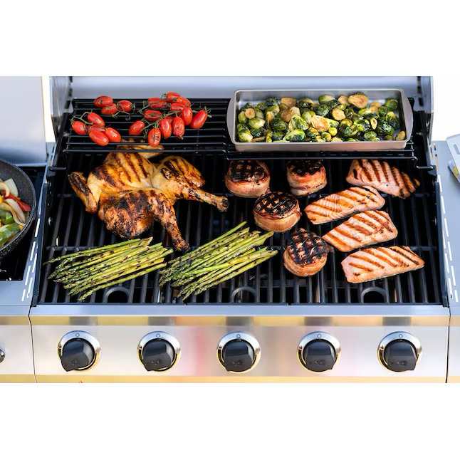 • Specifications Burner Material Stainless steel Primary Cooking Area (Sq. Inches) 480 Cooking Surface Material Porcelain-coated cast iron Propane Tank Included No Fuel Type Liquid propane Pullout Tank Tray No Griddle Included No Rotisserie Burner No Hose Included Yes Rotisserie Burner BTUs 0 Ignition Type Electronic Sear Burner None Infrared Burner No Sear Burner BTUs 0 Integrated Lights No Side Burner BTUs 10000 Integrated Smoker Box No Side Shelf Fixed Lid Material Stainless steel Team Name N/A Team/League N/A Main Burners BTUs 37500 Temperature Gauge Yes Natural Gas Conversion Kit Included No (not convertible) Total Cooking Area (Sq. Inches) 645 Natural Gas or Convertible to NG No Warming Rack Yes Number of Main Burners 5 Warming Rack Area (Sq. Inches) 165 Number of Side Burners 1