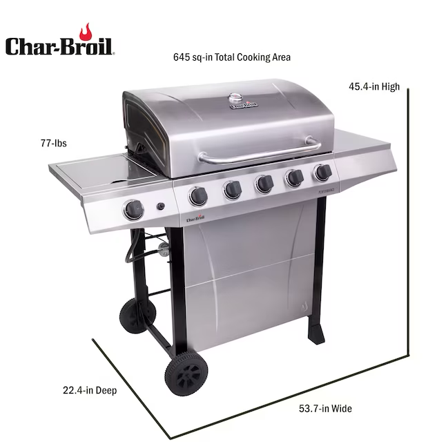 The Char-Broil® Performance Series™ 5-Burner Gas Grill, a reliable, versatile and feature-packed grill. With 645 square-inches of total cooking space and a side burner, this grill can fit up to 36 burgers. We included the Chef's Delite tray to cook your most delicate foods. It’s easy to assemble and equipped with electronic ignition to ensure reliable starts. The side shelves integrate with Gear Trax™ accessories to organize your workspace. And a sleek upgraded design, with chrome control knobs, gives it polished good looks.
