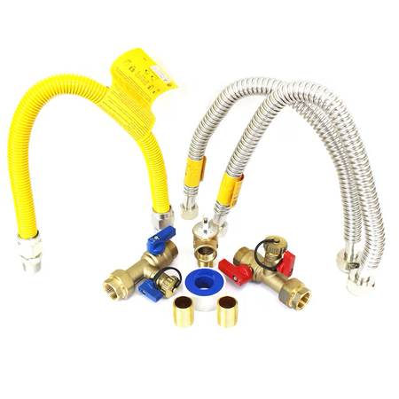 ALSO INCLUDED: (2) 3/4 in. Brass Nipples, (2) Water Connectors 3/4 in. FIP X 3/4 in. FIP X18 in., (1) Gas Connector 3/4 in. x 3/4 in. x 18 inch,(1) Pressure Relief Valve, (1) Hot Valve, (1) Cold Valve, and FREE PTFE Thread Seal Tape