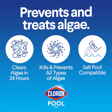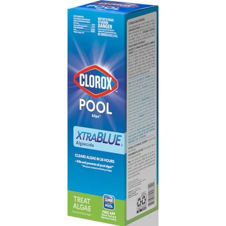 Clorox® Pool&Spa™ XtraBlue® Algaecide is the ultimate algaecide solution to kill and prevent all types of pool algae - including swampy green algae, slippery mustard algae, and tough, stubborn black algae. This non-foaming, non-staining treatment clears algae in 24 hours and works great in all pool types. Use as a preventative algaecide weekly if your pool is prone to algae or when the temperature increases during the peak of summer. Always apply chemicals according to label directions. Circulating pool water when applying chemicals helps disperse chemicals throughout the pool for maximum coverage.