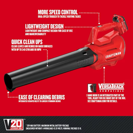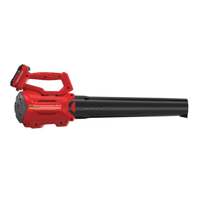 - Specifications Amperage 0 Interchangeable Tips No Application Sweeping and cleanup of small areas Lowe's Exclusive No Battery Amp Hours 0 Manufacturer Color/Finish Red/Pink Battery Included Yes Maximum Air Speed (MPH) 90 Battery Voltage 20-volt max Maximum Air Volume (CFM) 340 Brushless No Mulching Capable No CARB Compliant N/A Number of Batteries Included 1 Charger Included Yes Package Contents (1) CMCBL700, (1) Blower Tube, (1) Charger and (1) V20 Battery