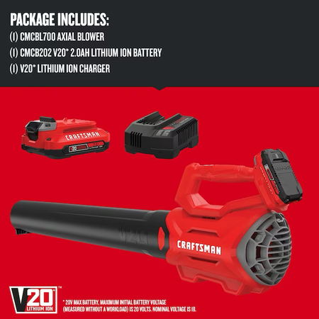 Includes CMCBL700 Axial Blower, CMCB202 V20 2.0 Ah lithium ion battery and V20 lithium ion charger