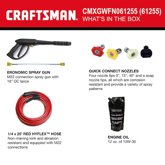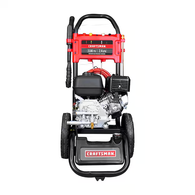 The CRAFTSMAN 3100 PSI at 2.4 GPM gas pressure washer powered by a reliable Craftsman engine provides all the power you need to tackle your cleaning tasks. Four quick-connect spray tips allow you to quickly adjust the spray pattern to best fit the task at hand, a 25-foot flexible hose makes for easy maneuvering, and a detergent tank for simple soap application.