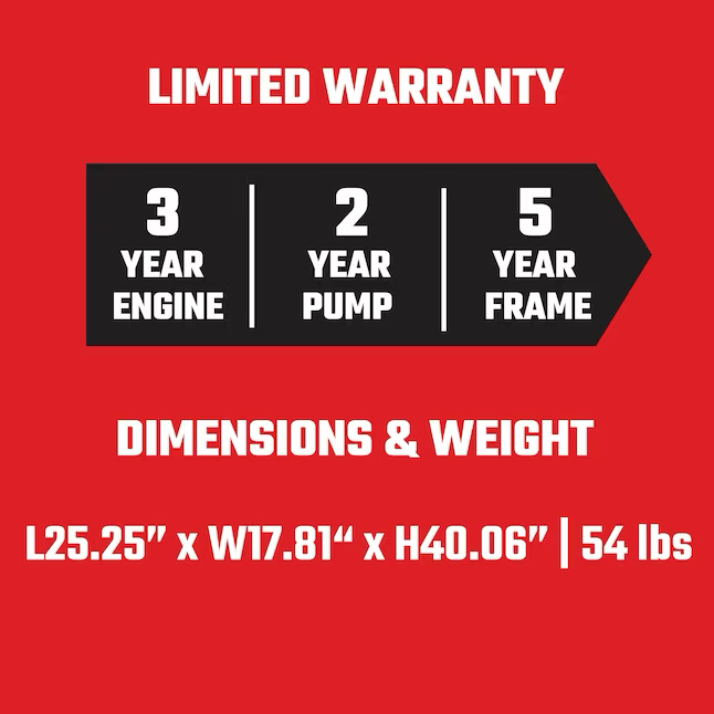• 3 Year Limited Engine Warranty, 2 Year Limited Pump Warranty, 5 Year Limited Frame Warranty, 90 Day Accessory Warranty