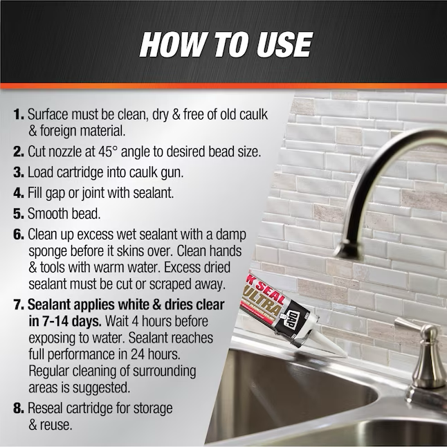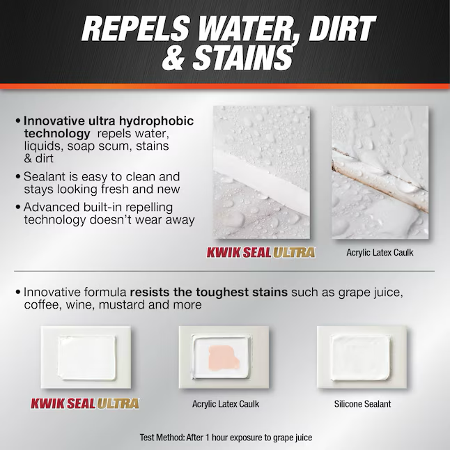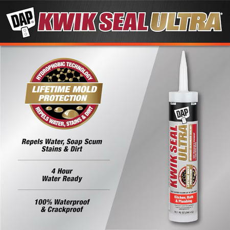 KWIK SEAL ULTRA is a premium kitchen and bath sealant that repels water, stains and dirt so the sealant stays looking fresh and new. Repels water, dirt, and soap scum, stain proof protection, lifetime mold and mildew resistance guarantee, easy to use, ready for water in only 4 hours, easy water clean up. Sealant applies white and dries clear in 7-14 days depending on joint depth, temperature and humidity.