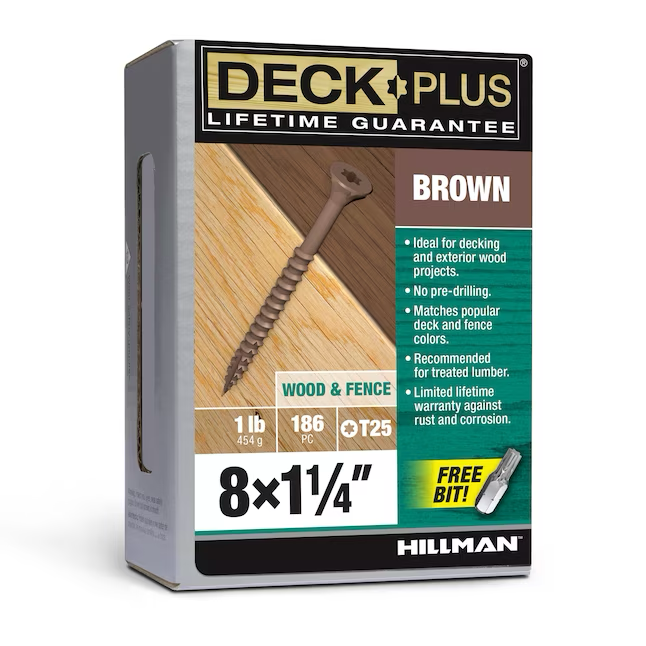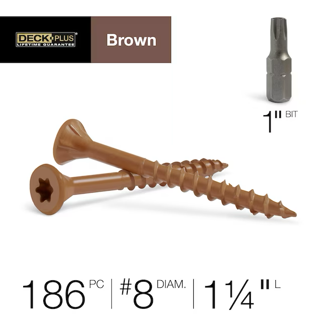 Deck Plus wood and fence screws were designed to provide superior weather protection that matches the finish of your deck. Countersinking nibs under the head of the screw cut a perfect finished hole by transporting wood fibers out and sealing the surface. The epoxy coating provides superior rust and corrosion resistance with 4 layers of protection - a zinc layer, a chemical adhesion layer, an epoxy coating, and a durable protective finish.