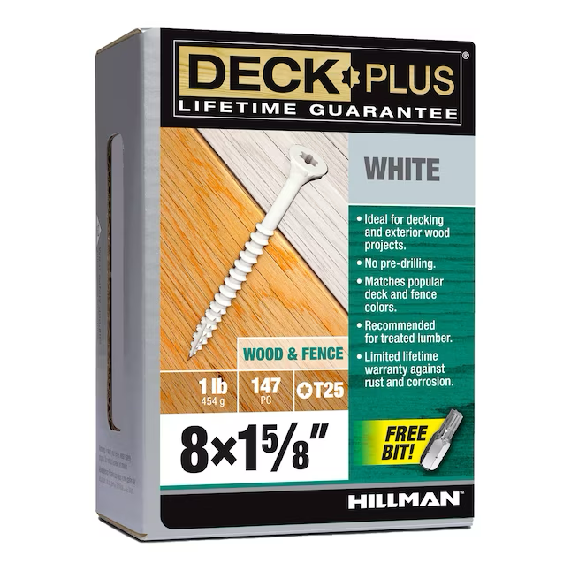 Deck Plus Wood and Fence Screws were designed to provide superior weather protection that matches the finish of your deck. Countersinking nibs under the head of the screw cut a perfect finished hole by transporting wood fibers out and sealing the surface. The epoxy coating provides superior rust and corrosion resistance with 4 layers of protection - a zinc layer, a chemical adhesion layer, an epoxy coating, and a durable protective finish.