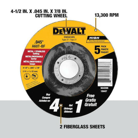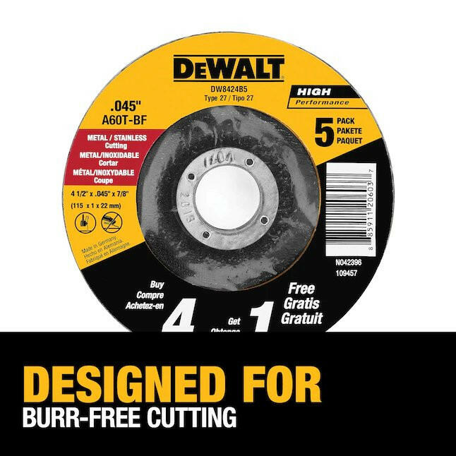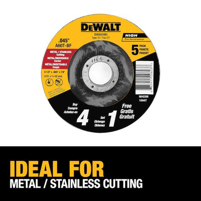 • Specifications Application Cutting For Use with Ferrous Metal Yes For Use with Aluminum No For Use with Stainless Steel Yes For Use with Angle Grinders Yes For Use with Tile No For Use with Asphalt No Grit N/A For Use with Chop Saws No Material Silicon carbide For Use with Circular Saws No Package Quantity 5 For Use with Concrete & Masonry No Threads Per Inch 0 For Use with Cut-Off Saws No Wheel Type Grinding wheel For Use with Ductile Pipe No