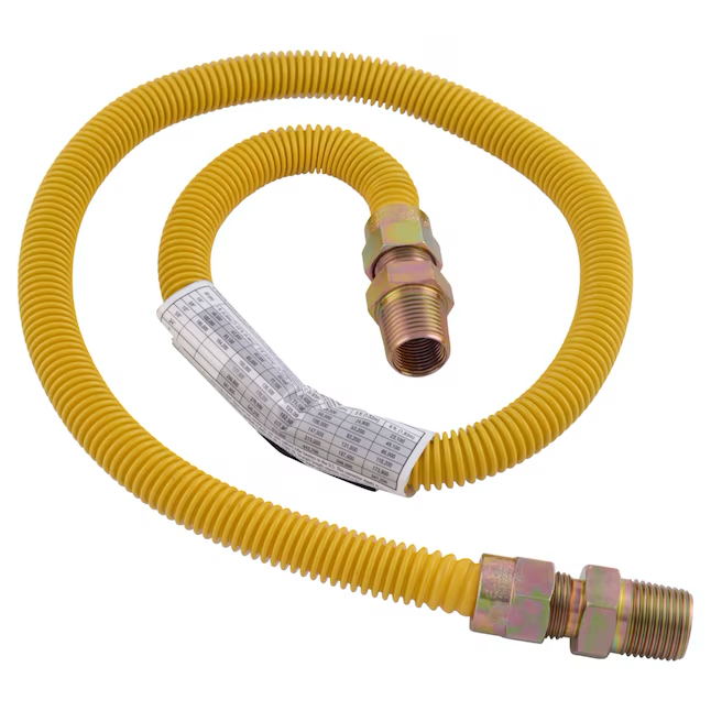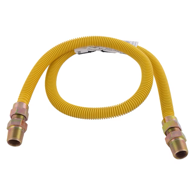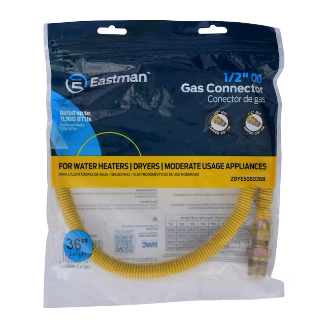 - Specifications Inlet Fitting Size (Inches) 1/2 Size - Length 36-in Outlet Fitting Size (Inches) 1/2 BTU Rating 71100 Outlet Fitting End Type MIP High Efficiency No Package Quantity 1 Inlet Fitting End Type MIP Use Gas connector Material Stainless steel Working Temperature Range -20 to 150 degrees F Maximum PSI 0.5