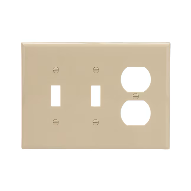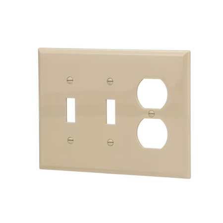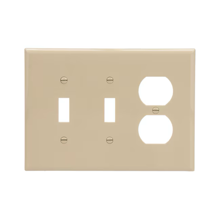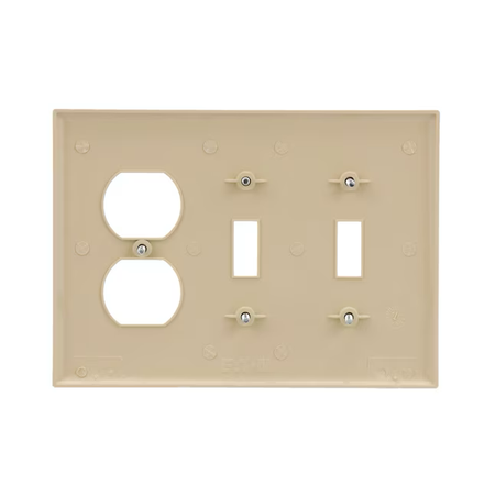 • Mid-size three-gang wall plate designed for use with two toggle switches and one duplex receptacle