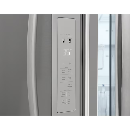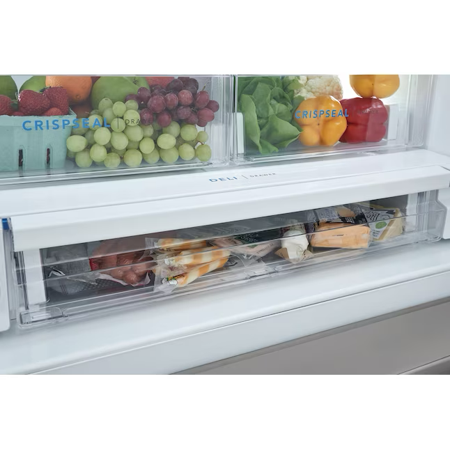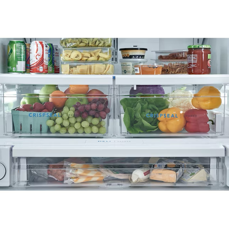 This Frigidaire French door refrigerator helps keep fruits and vegetables fresh longer with CrispSeal® crispers which blocks dry air from entering your crisper to avoid premature shriveling. Easily stay organized with a full width deli drawer and large door bin storage. Keep safe, great tasting water flowing. Our filter reduces up to 99% of contaminants, cuts back on plastic and saves the cost of bottled water (NSF and WQA certified).