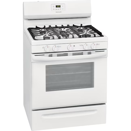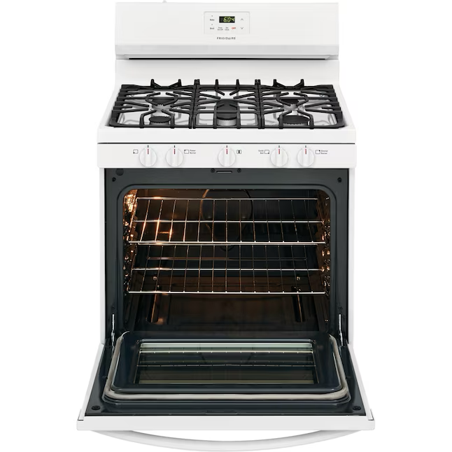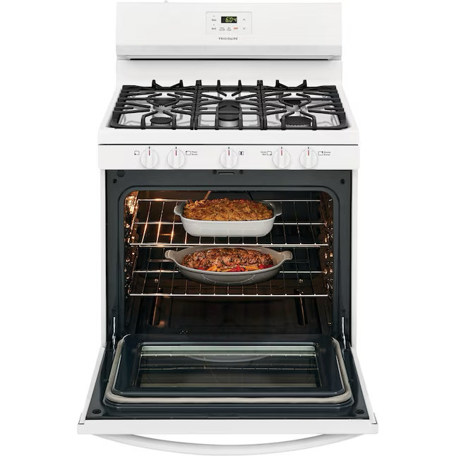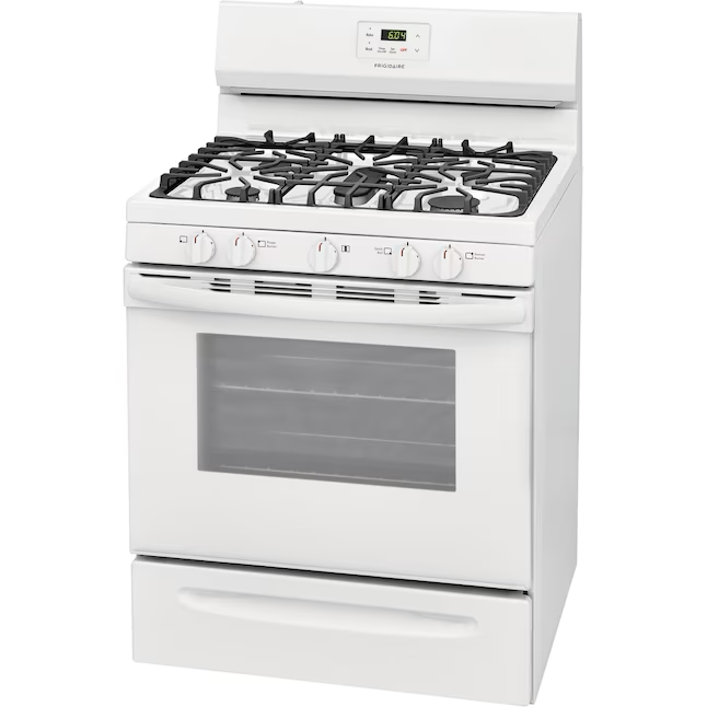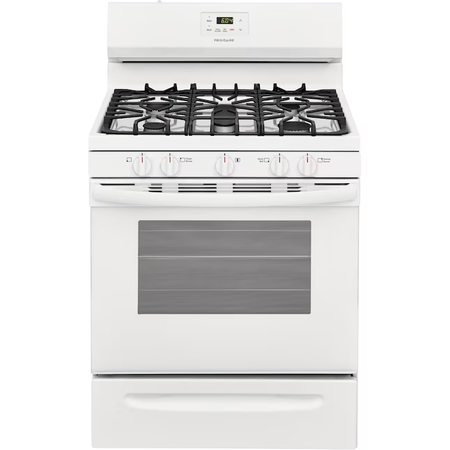 The Frigidaire 30-in gas range gives you more cooking flexibility with a 5.0 cu ft capacity oven and storage drawer. The cooktop features 5 sealed gas burners, including a 16,000 BTU quick boil burner, 10,000 BTU oval burner, and a low-simmer burner, so you can have precise temperature control with high and low heat.