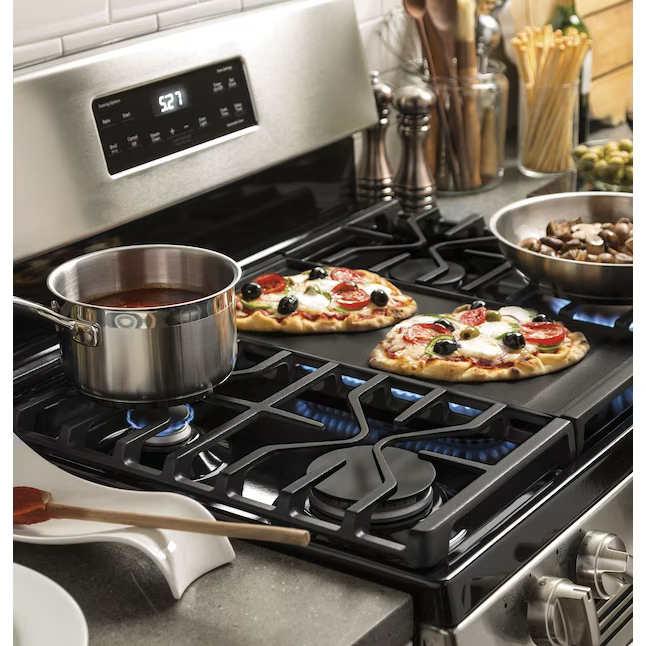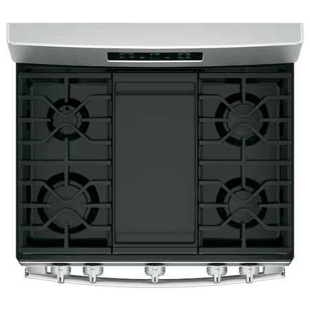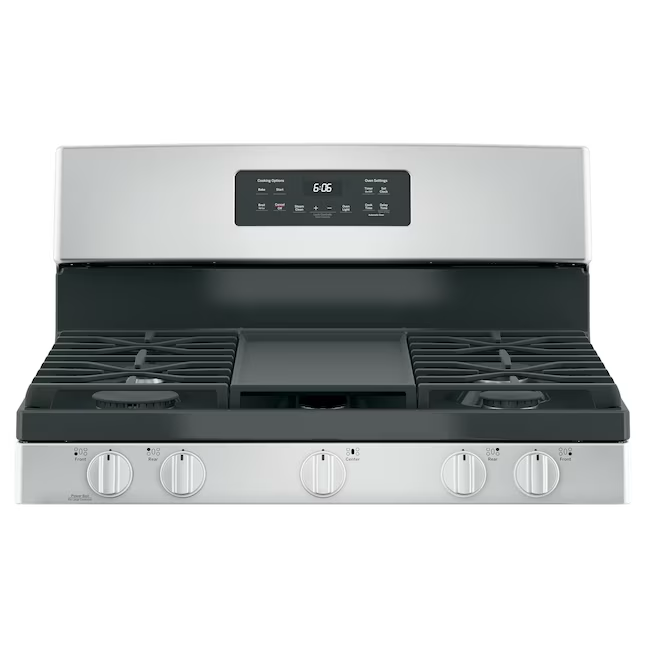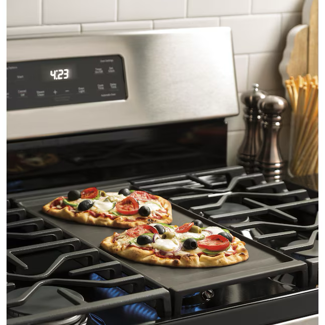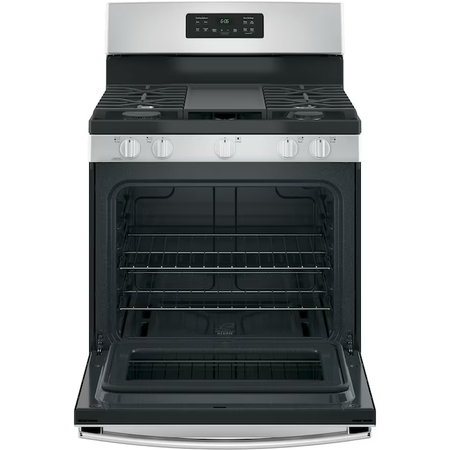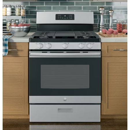 • Specifications ADA Compliant No Fuel Type Natural gas Adjustable Cleaning Levels No Glide/Rollout Racks No Air Fry No Half/Split Rack No Air Sous Vide No Hot Surface Indicator Lights No Appliance Type Single oven gas range Hub Required No Auto Re-Ignition No Ignition Type Electronic Automatic Convection Conversion No Installation Type Freestanding Automatic Shut-Off Yes Integrated Griddle Yes (Included) Broiler Drawer Yes Interior Light(s) Type Standard (incandescent) Burner #1 Max BTU 15000 Keep Warm Setting No Burner #2 Max BTU 12000 Light(s) Control Oven light touch pad Burner #3 Max BTU 9500