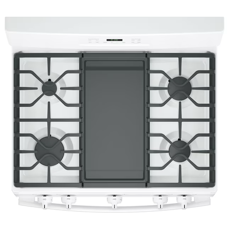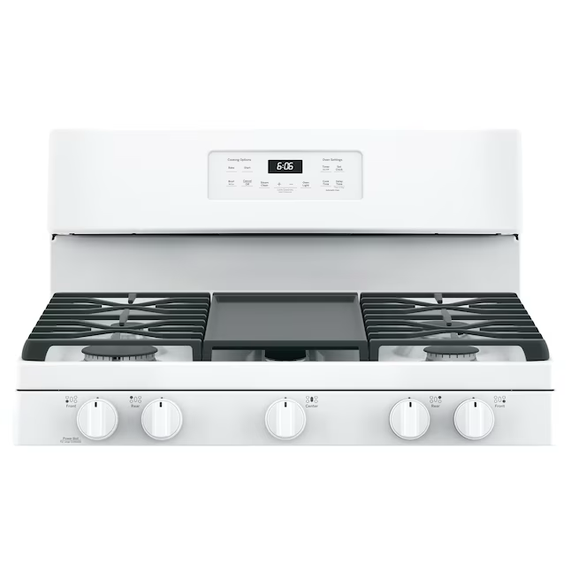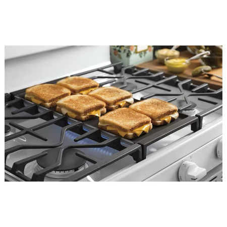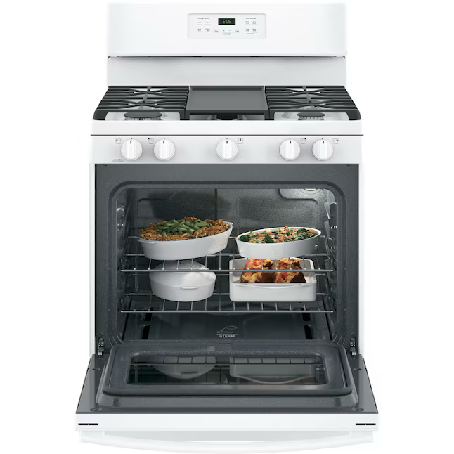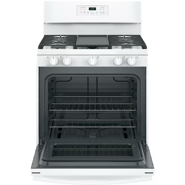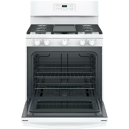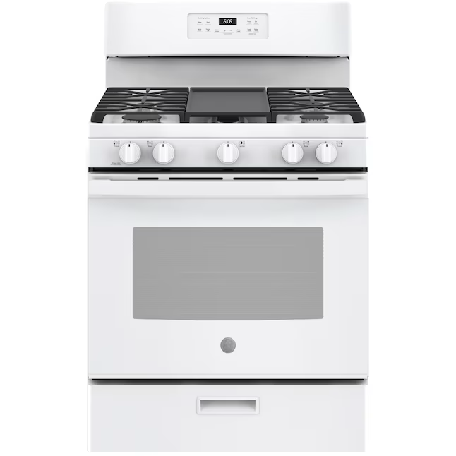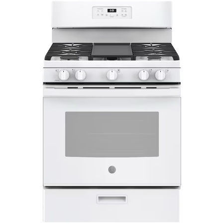 • Specifications ADA Compliant No Fuel Type Natural gas Adjustable Cleaning Levels No Glide/Rollout Racks No Air Fry No Half/Split Rack No Air Sous Vide No Hot Surface Indicator Lights No Appliance Type Single oven gas range Hub Required No Auto Re-Ignition No Ignition Type Electronic Automatic Convection Conversion No Installation Type Freestanding Automatic Shut-Off Yes Integrated Griddle Yes (Included) Broiler Drawer Yes Interior Light(s) Type Standard (incandescent) Burner #1 Max BTU 15000 Keep Warm Setting No Burner #2 Max BTU 12000 Light(s) Control Oven light touch pad Burner #3 Max BTU 9500