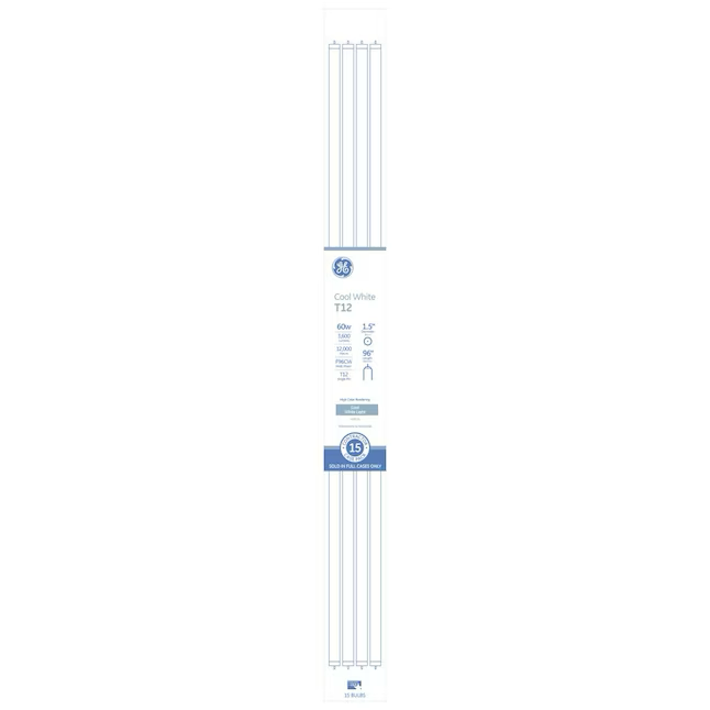• Features 3 Way No Motion Sensor(s) Included No Battery Back-Up No Package Quantity 15 Blacklight No Package Type Multi-pack Built-In Speakers No Plug-In Type Single-pin Bulb Material Glass Primary Usage Light fixtures Bulb Shape Linear Rapid Start Yes Bulb Shape Code T12 Rated Life (Hours) 12000 Bulb Type Fluorescent Remote Control Included No Dimmable No Scheduling Ability No Dusk-to-Dawn Sensor No Shatter Resistant Yes Edison No Tube Length (Inches) 48 Enclosed Fixture Rated Yes Tube Type Type A Energy Efficient No Usage Rating Damp rated Filament Style N/A Use Location Indoor/Outdoor Grade Commercial/Residential Vintage No Hub Required No Voice Controlled No Light Bulb Base Type Single pin (T12) Volts 120 Wattage 60 Lumens 3600 Wattage Equivalent 60