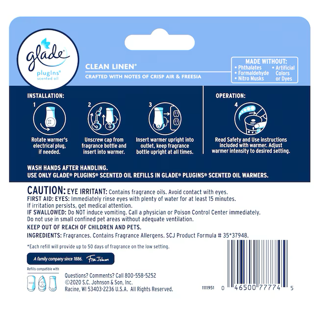 • Glade Plug In Clean Linen scented fragrance is is crafted by master perfumers and infused with Essential Oils