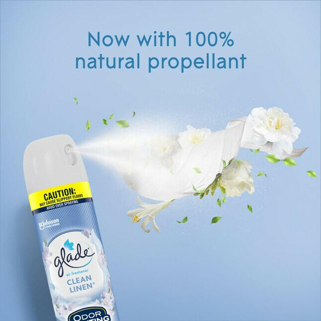 Clean Linen Glade Air Freshener Spray has a fragrance crafted by master perfumers, with notes of crisp air, fresh laundry, and Lily of the Valley