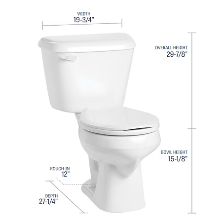 - Dimensions Assembled Depth (Inches) 27.25 Bowl Height with Seat 15-7/8-in Assembled Height (Inches) 29.875 Bowl Height without Seat 15-1/8-in Rough-In Size 12-in Assembled Width (Inches) 19.75 Trapway Size 2-in Bowl Height Standard height