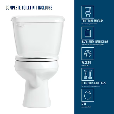 Complete Toilet Kit (CTK) includes: toilet bowl and tank, toilet seat, flange bolts, wax ring with polyethylene flange and instructions