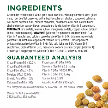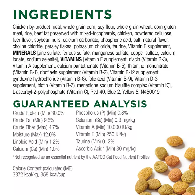 Chicken By-product Meal, Whole Grain Corn, Soy Flour, Whole Grain Wheat, Corn Gluten Meal, Rice, Beef Fat Preserved With Mixed-tocopherols, Chicken, Powdered Cellulose, Liver Flavor, Soybean Hulls, Calcium Carbonate, Phosphoric Acid, Salt, Natural Flavor, Choline Chloride, Parsley Flakes, Potassium Chloride, Taurine, Vitamin E Supplement, Minerals [Zinc Sulfate, Ferrous Sulfate, Manganese Sulfate, Copper Sulfate, Calcium Iodate, Sodium Selenite], Vitamins [Vitamin E Supplement, Niacin (Vitamin B-3), Vitamin A Supplement, Calcium Pantothenate (Vitamin B-5), Thiamine Mononitrate (Vitamin B-1), Riboflavin Supplement (Vitamin B-2), Vitamin B-12 Supplement, Pyridoxine Hydrochloride (Vitamin B-6), Folic Acid (Vitamin B-9), Vitamin D-3 Supplement, Biotin (Vitamin B-7), Menadione Sodium Bisulfite Complex (Vitamin K)], L-ascorbyl-2-polyphosphate (Vitamin C), Red 40, Blue 2, Yellow 5. N450019