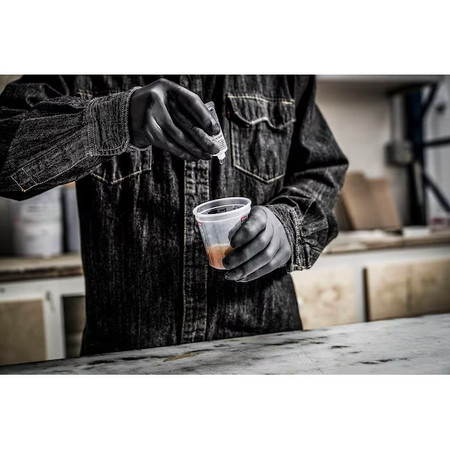 Liquid hardener designed to mix with Bonda polyester fiberglass resin and Bondo metal reinforced filler requiring liquid hardener
