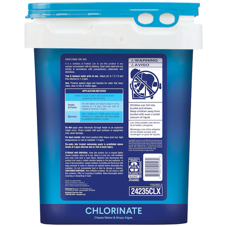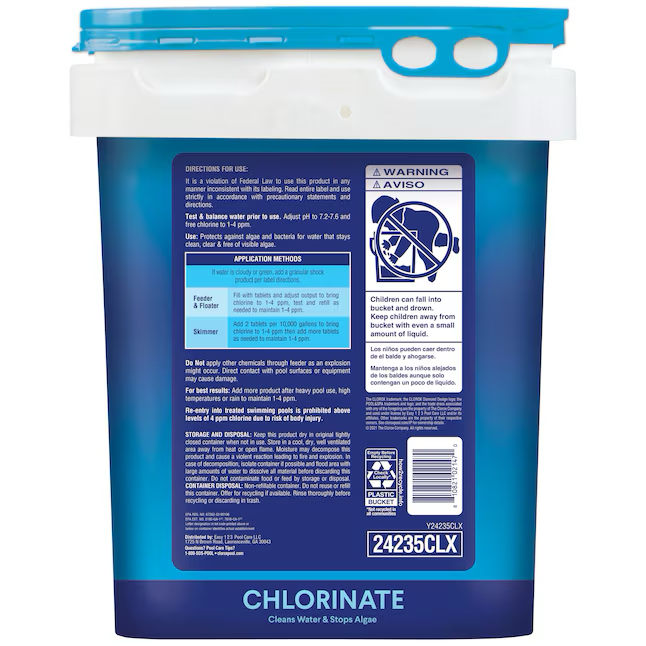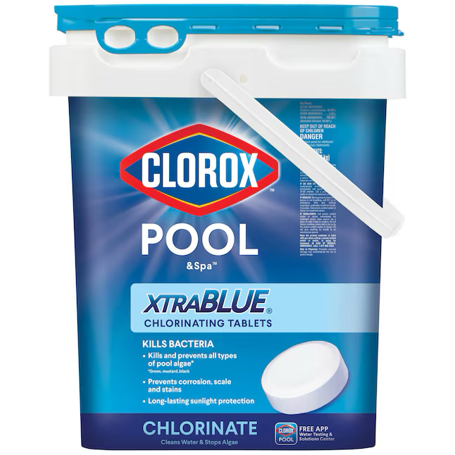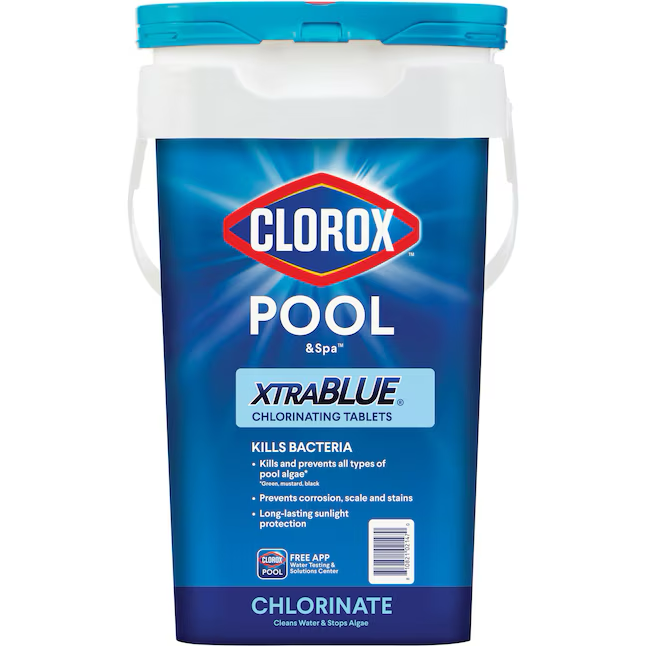 Clorox® Pool&Spa™ XtraBlue® Chlorinating Tablets go the extra mile to help maintain healthy pool water. These multi-functional tablets work hard to keep your water clear from both bacteria and unsightly algae. Each tablet dissolves slowly and contains stabilizer for a long-lasting clean. The XtraBlue® formula protects your surfaces from scale and corrosion and includes conditioners that make your water feel silky smooth. Maintaining 1-4 ppm of free chlorine is critical to keeping water clean and suitable for swimming. Use weekly in skimmers, feeders or floaters. Always apply chemicals per label directions. Circulating pool water when applying chemicals helps disperse chemicals throughout the pool for maximum coverage.