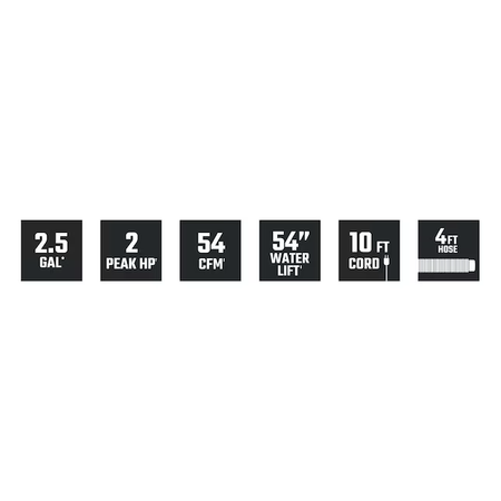 - Specifications Accessories Included Yes Corded/Cordless Corded Air Flow (CFM) 54 Filtration Type Foam Amperage 5.5 Horsepower 2 Battery Included N/A (corded) Lift-Out Blower No Battery Operated No Primary Application Home projects & renovations Blower Port Yes Sealed Pressure (Inches) 54 Built-In Attachment Storage Yes Tank Material Plastic Built-In Drain No Transport Handle Yes Built-In Pump No Voltage 120 Casters No Wet/Dry Wet/Dry