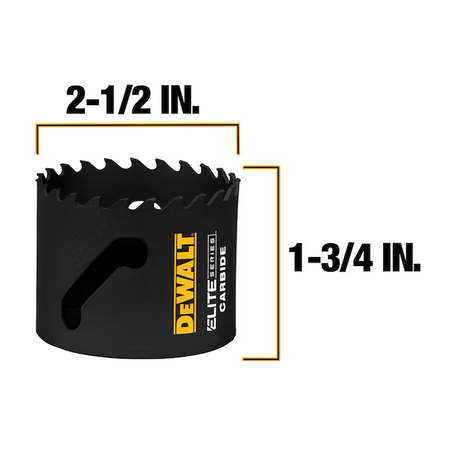 The DEWALT ELITE SERIES TM Metal Cutting Carbide Tipped Hole Saws last up to 3X longer vs Milwaukee® and feature advanced welding technology to increase bond strength and retain carbide tips. The carbide tipped cutting edge cuts through a variety of demanding materials such as wood with nails, thick metal, and stainless steel. An aggressive tooth design penetrates hard metals and removes chips efficiently to reduce heat buildup. The large, continuous slot provides multiple leverage points for easy plug removal.