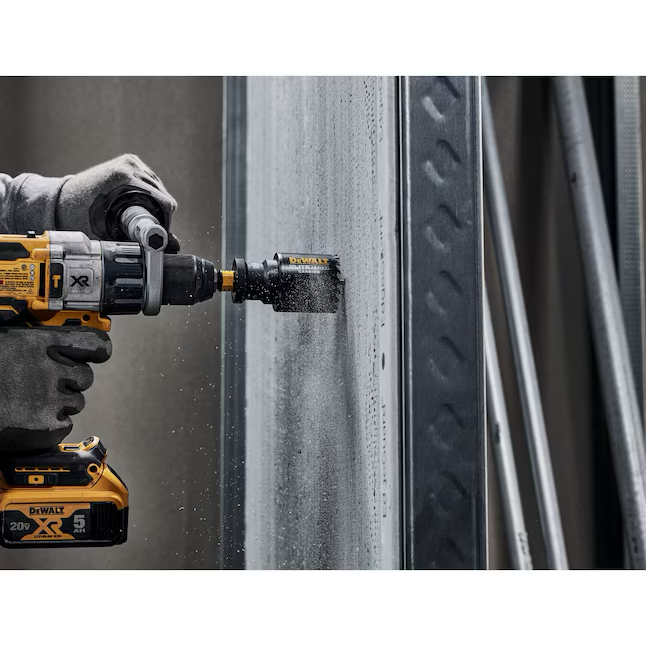 The DEWALT ELITE SERIES TM Metal Cutting Carbide Tipped Hole Saws last up to 3X longer vs Milwaukee® and feature advanced welding technology to increase bond strength and retain carbide tips. The carbide tipped cutting edge cuts through a variety of demanding materials such as wood with nails, thick metal, and stainless steel. An aggressive tooth design penetrates hard metals and removes chips efficiently to reduce heat buildup. The large, continuous slot provides multiple leverage points for easy plug removal.