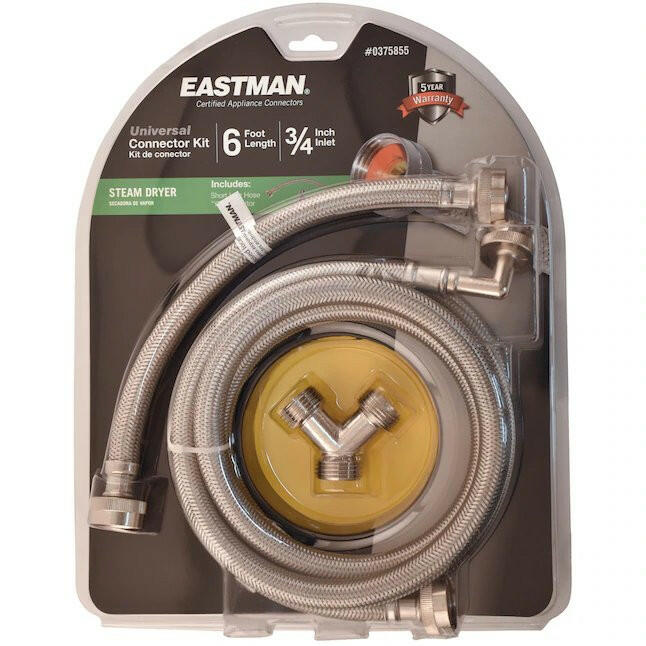 The Eastman steam dryer hoses feature superior performance for a reliable leak-free connection use after use. They can withstand full flow and high pressure, preventing kinking and crimpling. These flexible hoses are built with top-quality braided stainless steel, designed not to burst. The inside is designed with a non-toxic PVC core, a multi-filament braided nylon reinforcement, and a clear vinyl outer shell for durability. Made Right. Made to Last. Includes (1) 6-foot fill hose with 3/4-inch FHT connection and a 90-degree elbow, (1) 1-foot hookup hose with 3/4-inch FHT connection, and (1) Y adapter.