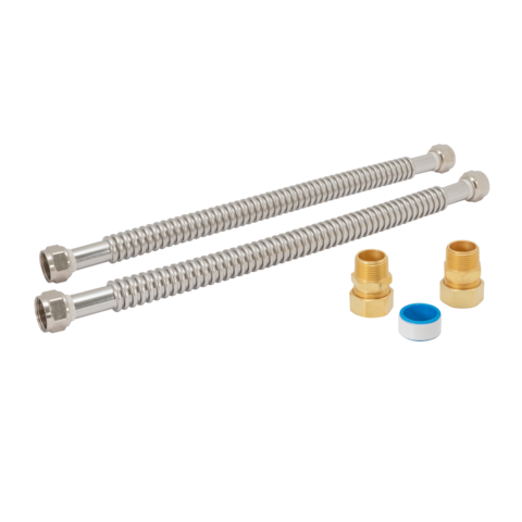 • Kit includes (2) 18 in. flexible water supply connectors, (2) compression adapters, and (1) roll of sealing tape
