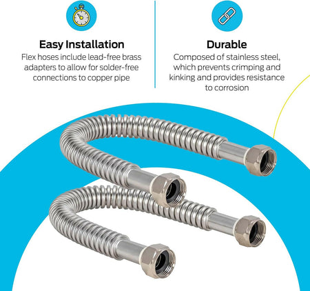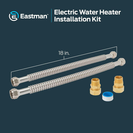 The Eastman Water-Flex electric water heater installation kit includes everything you need to install or replace the connectors of your water heater. This kit will save you shopping time by including all the necessary components that you need for your water heater installation, no need to look individually for each part! The end connections are built to provide a safe and solid bond that will prevent any disconnects and leaks for many seasons, equipped with dielectric sleeve. Lead-Free compliant for potable water applications.
