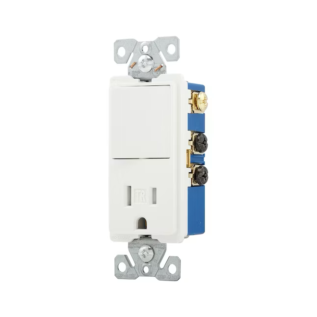 • Specifications AFCI Protection No Rust Resistant No Amperage 15 Self-Test No Audible Alarm No Style Decorator Collection Name N/A Sub-Brand N/A Connection Type Back wire (clamp) or side wire Surge Protection No For Use with Mobile Homes No Tamper Resistant Yes For Use with RVs No Type Switch outlet Function Type Combination outlet USB Port No GFCI Protection No USB Type N/A Grade Residential/Commercial Use Location Indoor Grounding Type Grounded Voice Controlled No Hub Required No Volts 120/125-volt Industry Color White Wall Plate Included No Lockable No Weather Resistant No Manufacturer Color/Finish White Wire Type Copper NEMA Configuration 5-15R Wireless No Night Light No Wiring Type 3-wire