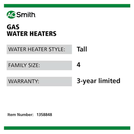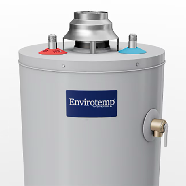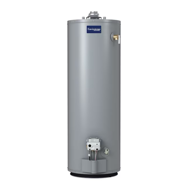 Envirotemp's 40-Gallon Tall Low NOx Atmospheric Vent Natural Gas Water Heater provides efficient and reliable hot water for households with 3 to 4 people when sized appropriately. With an environmentally friendly 35,500 BTU Low NOx gas burner, this 40-gallon tall gas water heater delivers 65 gallons of hot water in the first hour. The electronic gas valve provides precise temperature control for optimum hot water delivery without the need for an external power source. For your convenience, the gas valve also includes an LED status indicator for diagnostics reporting and a push button ignition to simplify the startup process. Envirotemp's 40-gallon model is designed with your safety in mind. With a built-in safety system, this model reduces the risk of accidental flammable vapor ignitions. A factory-installed temperature and pressure relief valve and tamper-proof drain valve also ensures safe operation. This model is built to last. It features Tank Guard® which is designed to proivde ultimate tank protection and increase lifespan of the water heater. Delivers the ideal amount of hot water for households with 3 to 4 people when sized appropriately